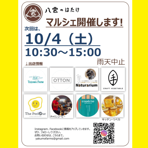イベント イベント予定 インフォメーション マルシェ 0 【マルシェ&イベント】2025/10/18(土)マルシェ&野点&カンナポンポン&体験!窯焼きピザ... イベント / イベント予定 / インフォメーション / マルシェ 2025年10月13日 次回マルシェ、10/18(土)開催予定です。本州直撃はしませんでした...