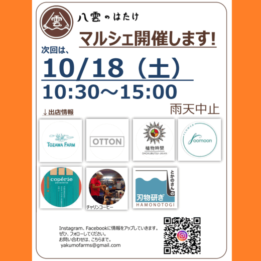 イベント イベント予定 インフォメーション マルシェ 0 【マルシェ】2025/7/19(土)朝マルシェ イベント / イベント予定 / インフォメーション / マルシェ 2025年7月14日 台風5号の影響はあまりなかったですね。八雲あたりはそれほど雨も降らず...