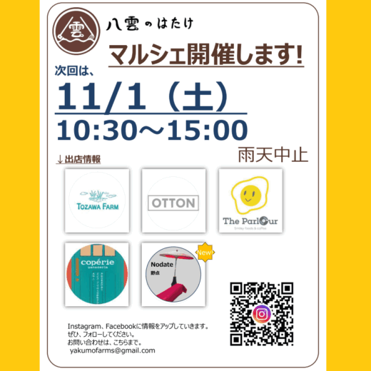 イベント イベント予定 インフォメーション マルシェ 0 【マルシェ&イベント】2025/11/1(土)マルシェ&芋煮会 イベント / イベント予定 / インフォメーション / マルシェ 2025年10月20日 朝晩は肌寒さを感じるようになりましたね。秋が一気に深まってきた感じが...