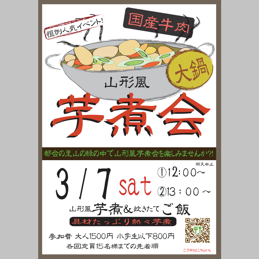 イベントは、山形風芋煮会!醤油ベースの国産牛と里芋・こんにゃく・きのこで作ります。