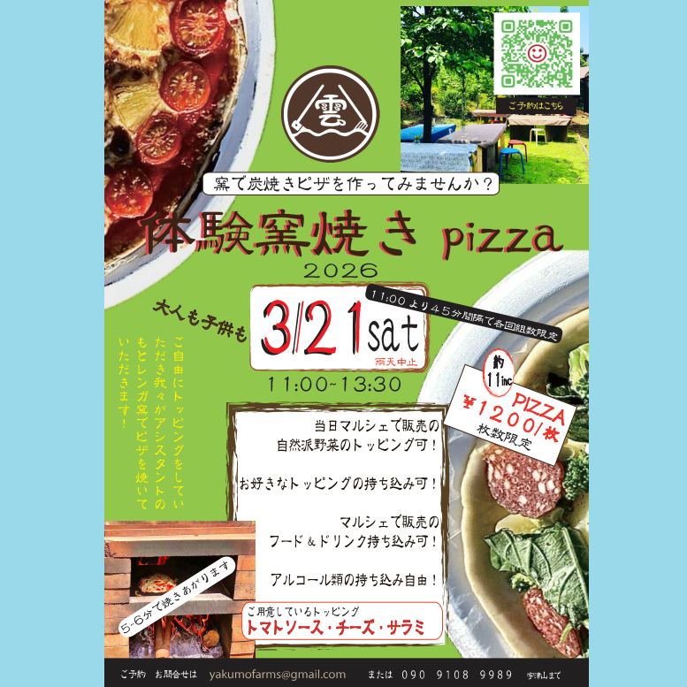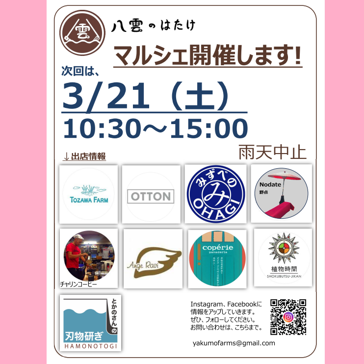 次回の八雲のはたけマルシェは、3/21(土)です。イベントは恒例の「体験窯焼きピザ」開催します。 春らしい変わりやすい天候が続いていますが、なんとか開催できたらいいな、と思います。 ちょうど桜が咲いてお花見ができるかもしれませんね。八雲のはたけには、ソメイヨシノはないのですが、ちょっと地味目なオオシマザクラと、今春移植した、ジンダイアケボノ桜があります。 お楽しみに。